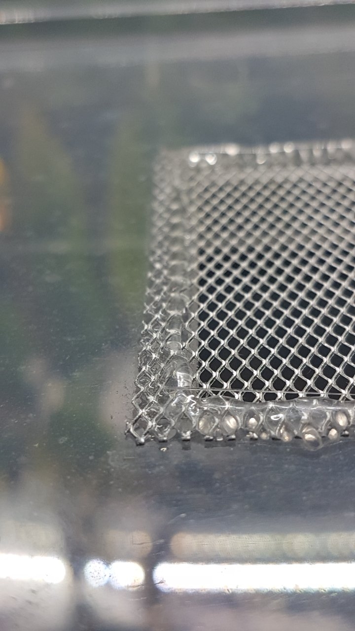 Nu visar inte bilden en nätad fläkt men samma princip borde fungera för en fläkt också. Detta nät sitter på utsidan av en liten burk och är inte helt täckt av lim då grodorna ändå inte kommer åt kanterna. Ta lite mer lim än på bilden så blir det helt kantfritt.