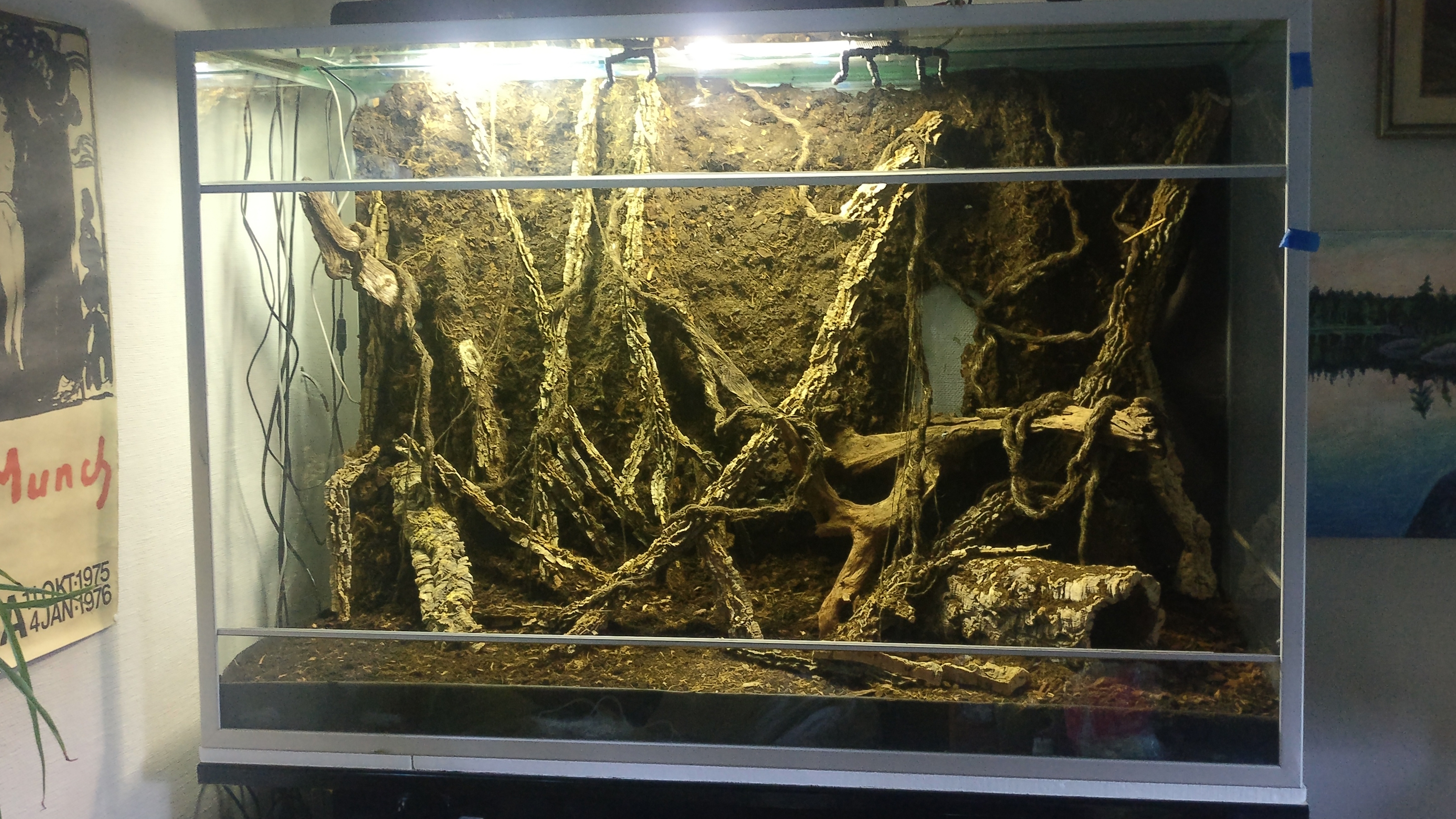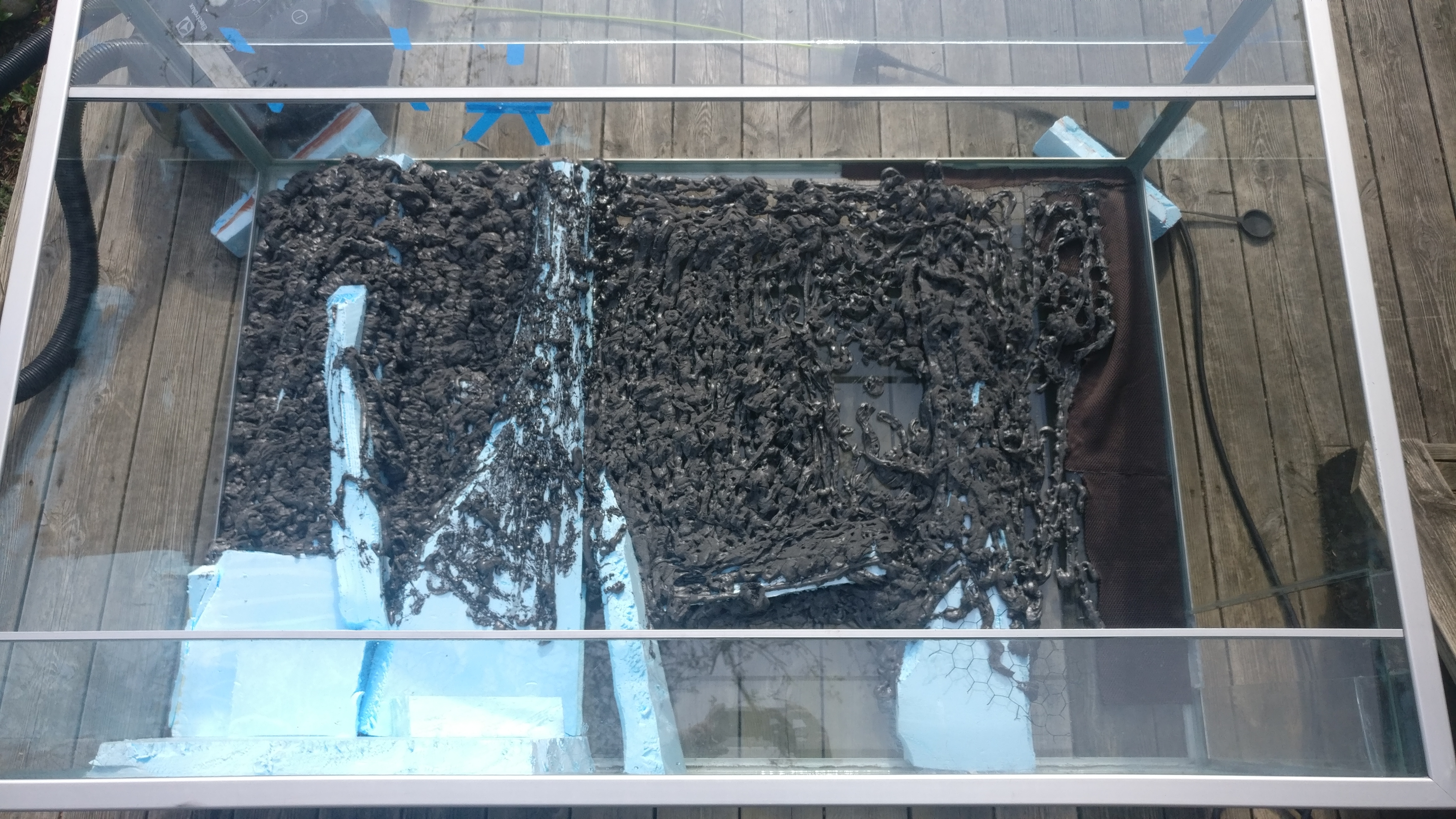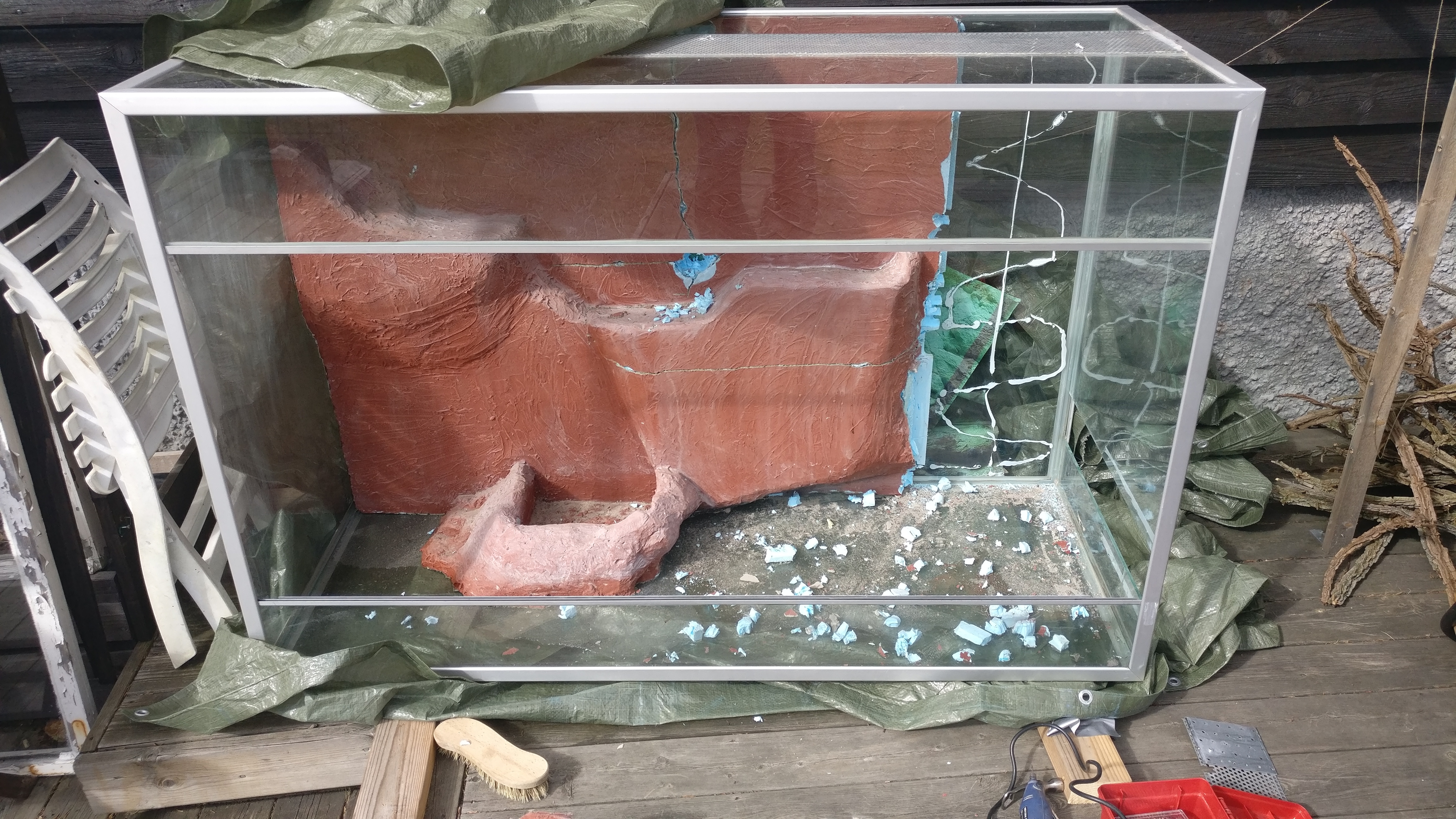 Måtten på denna nya burk är hela 1500x600x1000 (L,B,H) och är helglasat med aluminiumram. Jag köpte det billigt på blocket och har bytt ut den tidigare bakgrunden, en del glas samt applicerat ny silikon för att få det tätt.