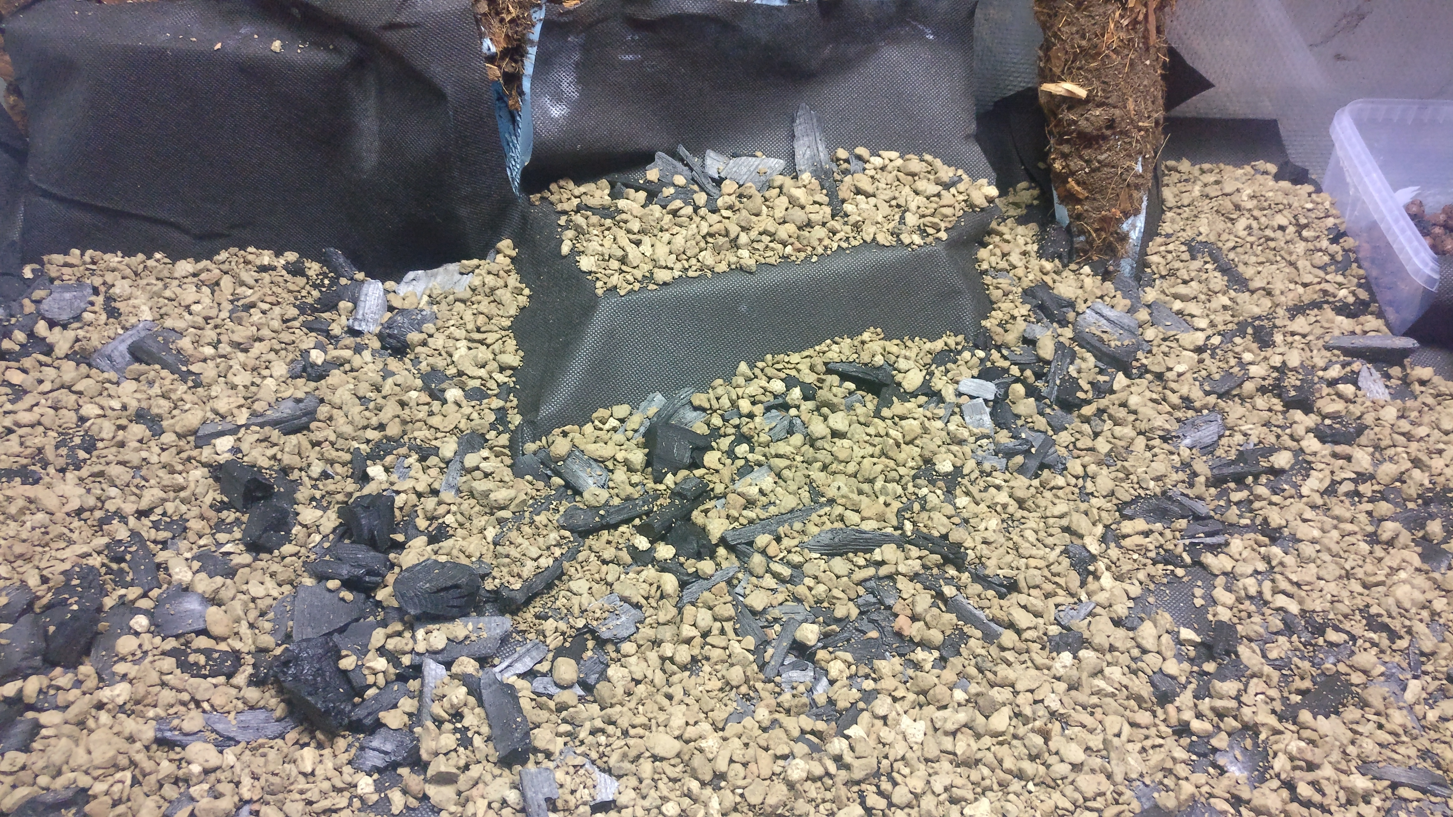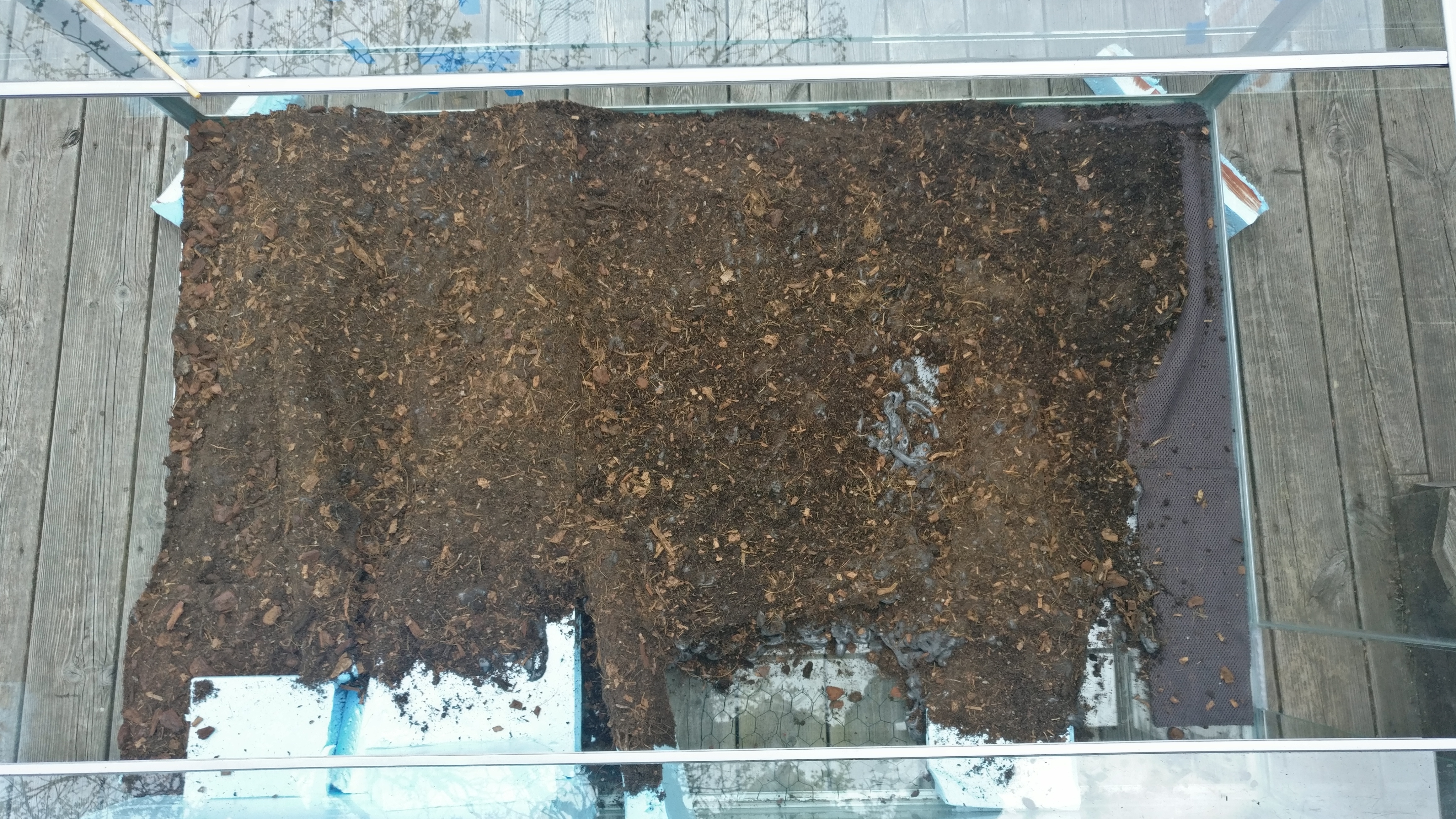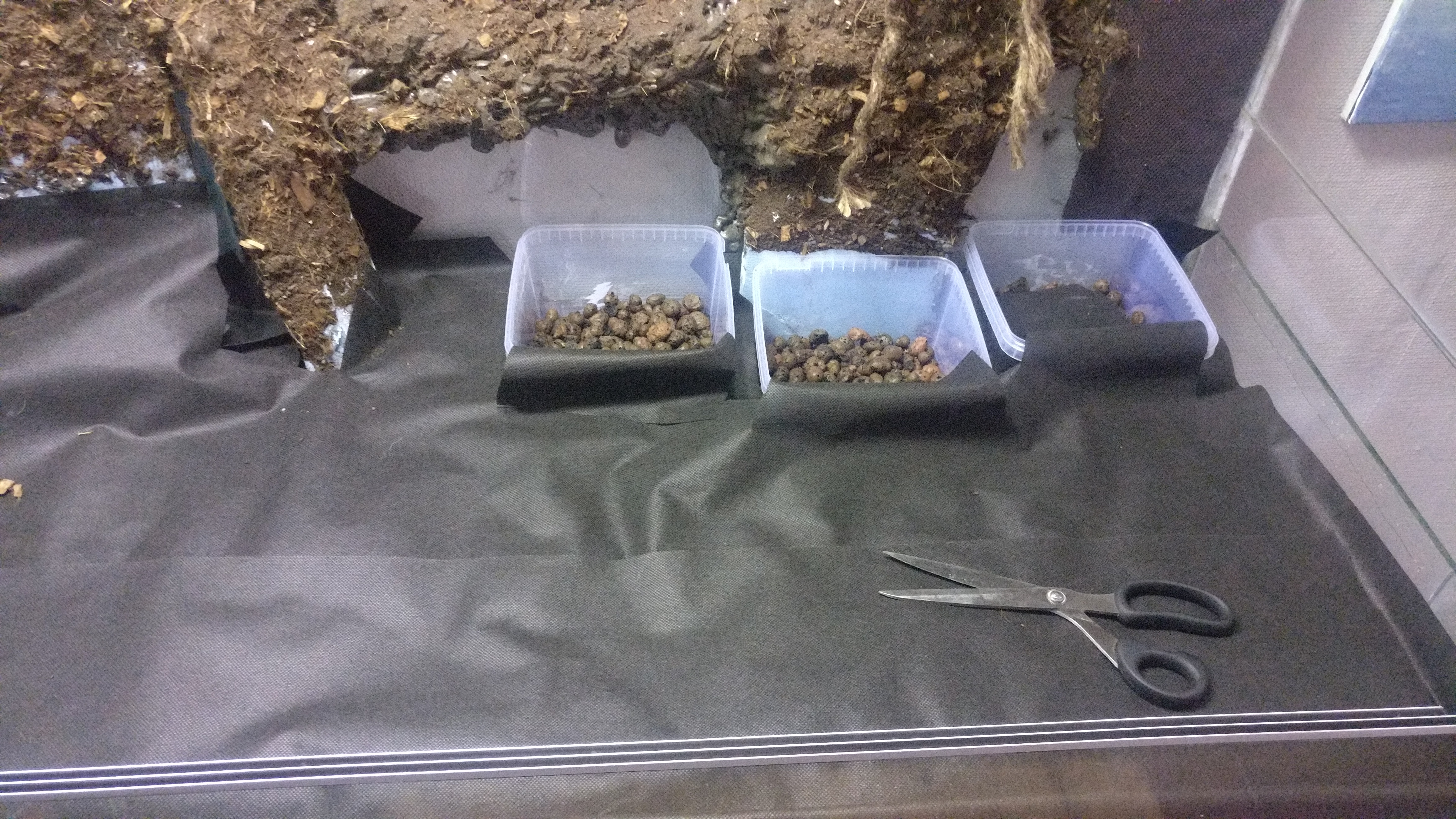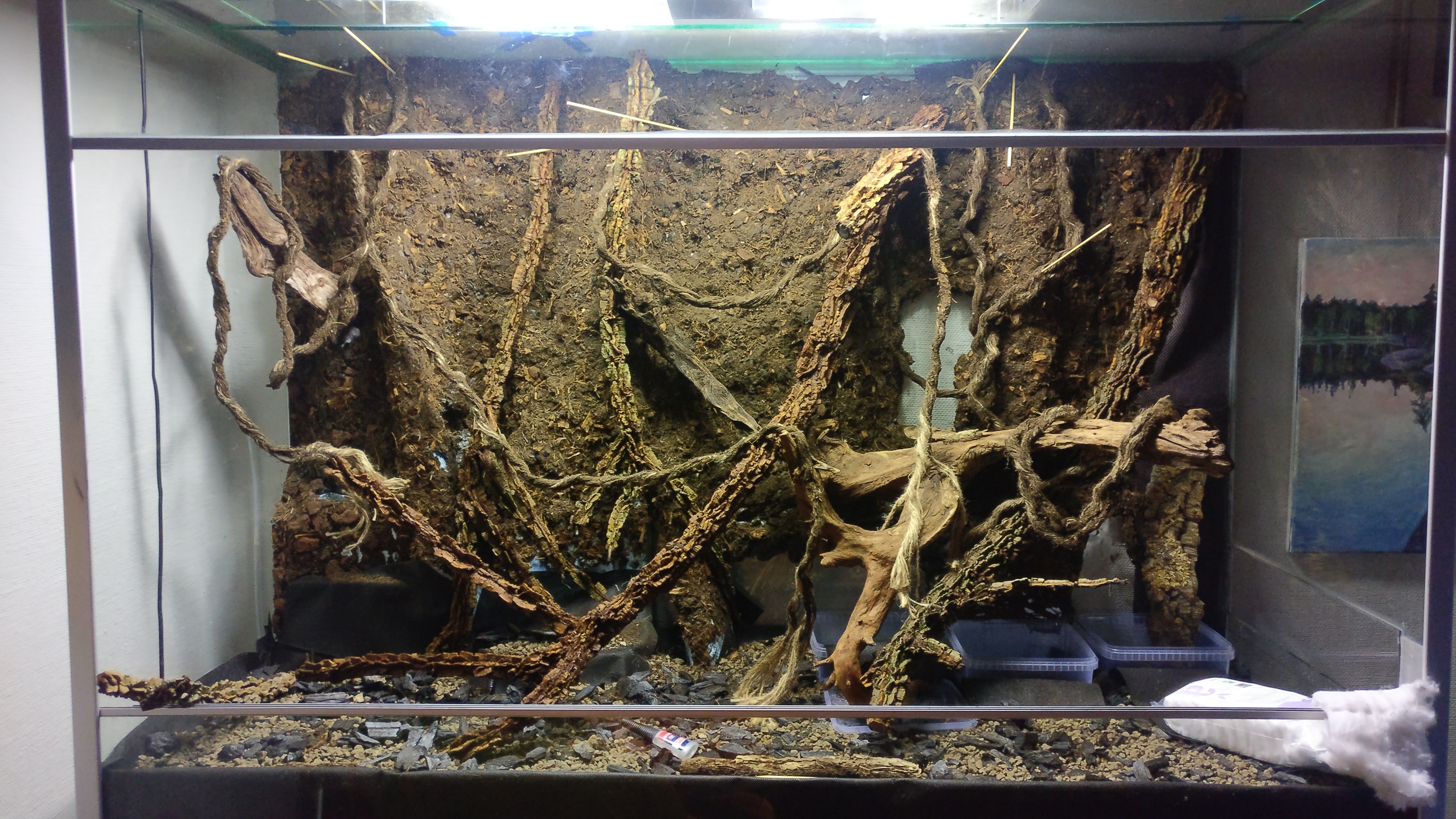 Måtten på denna nya burk är hela 1500x600x1000 (L,B,H) och är helglasat med aluminiumram. Jag köpte det billigt på blocket och har bytt ut den tidigare bakgrunden, en del glas samt applicerat ny silikon för att få det tätt.