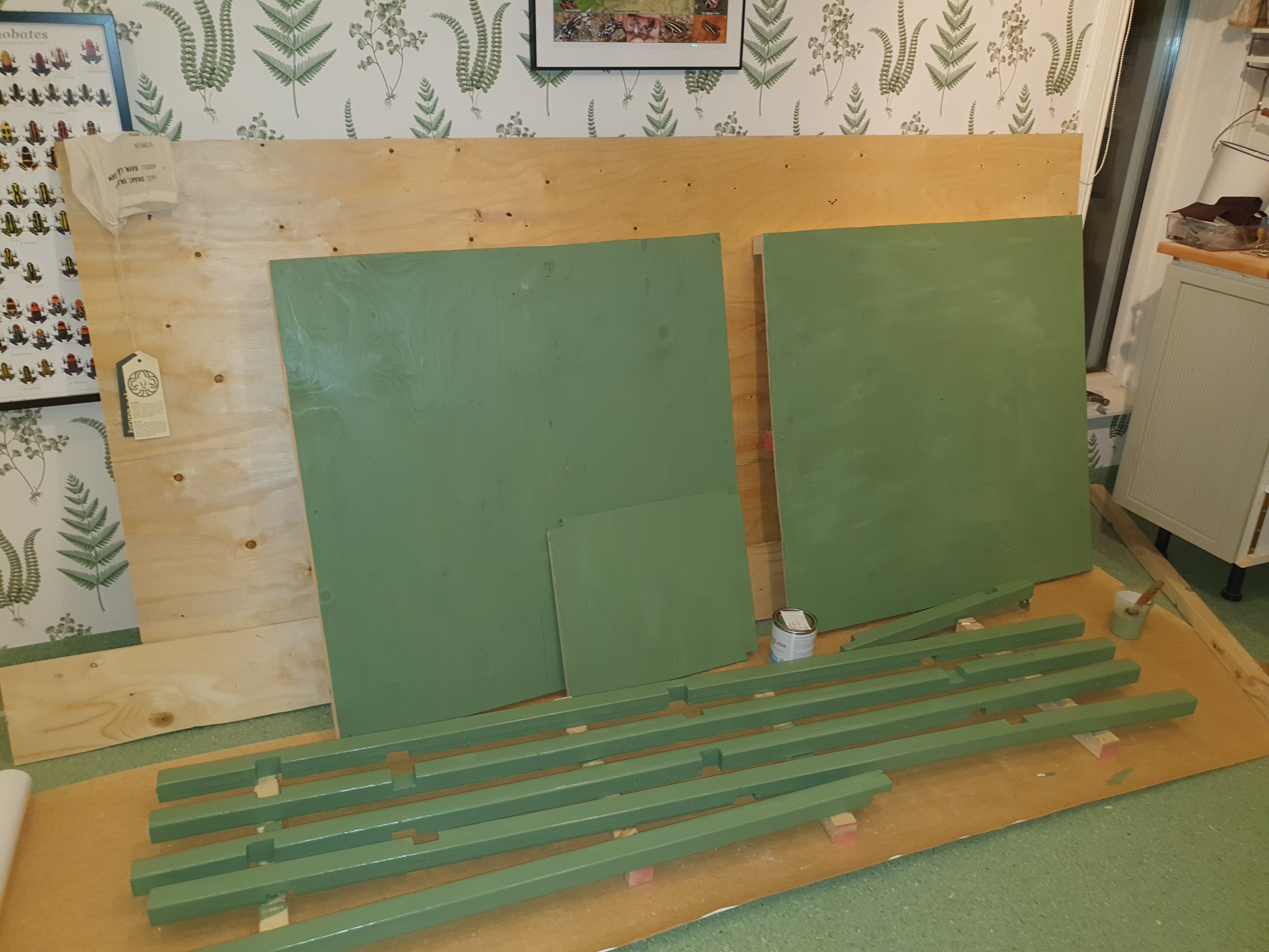 Första delen av bygget är att skapa sockeln som burken ska stå på. Bygger den av 45x45 reglar och plywood som jag måla. Sjukt mycket måla blir det och min fru kommer med glada till rop som t.ex. "Det ser ut som när våra barn målade på dagis" vilket jag kanske inte tror är en komplimang. Byggde toppen och botten separat och sedan monterade ihop dem i ett nästa steg. Ihopsatta. Det ska mer än väl hålla för vikten av burken och all teknik. I sockeln kommer jag ha plats för det som behövs för regnsystem, elinstallationer, avrinning/sump och annat smått och gott som jag kommer visa allt eftersom de kommer på plats. Den kommer kläs in i plywood så det kommer inte vara öppet under när allt är klart. Eftersom den kommer stå mitt i rummet har jag valt att ställa hela sockeln på rejäla industrihjul som har låsmekanism. De klarar 300kg styck så de kommer också hålla. Har redan testat dem på min näst största burk 120x50x70 och hjulen var riktigt smidiga när jag rullade runt den.