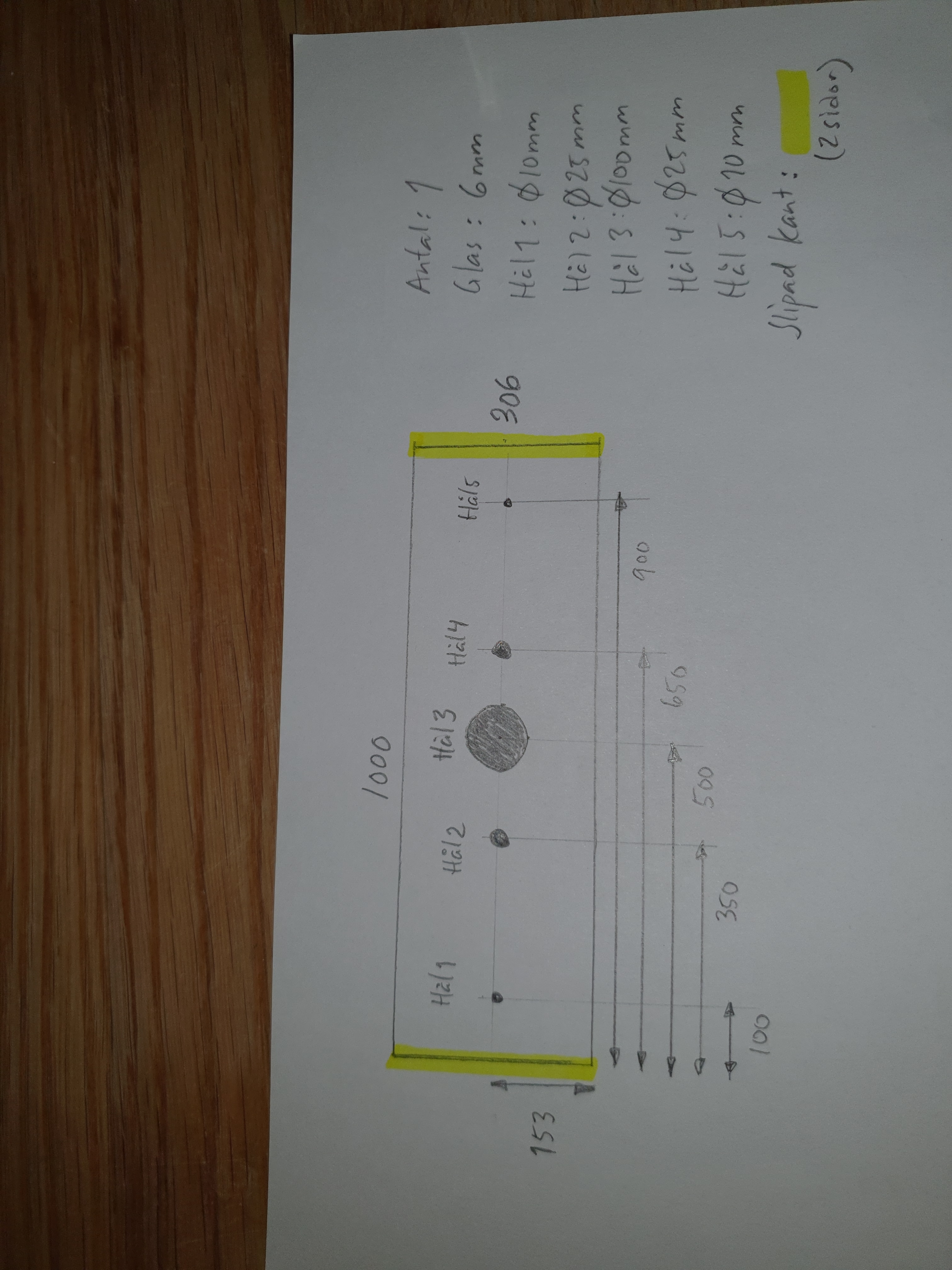 Mittensektionen av toppen också den i 6mm Float. Hålet i mitten är öppningen för glaskolumnen och sedan är det de två sista hålen (d 10 mm) för dysor vilket ger totalen 8 st i ytterkant av toppen. De sidor som blir ytterst kommer ha polerade kanter.