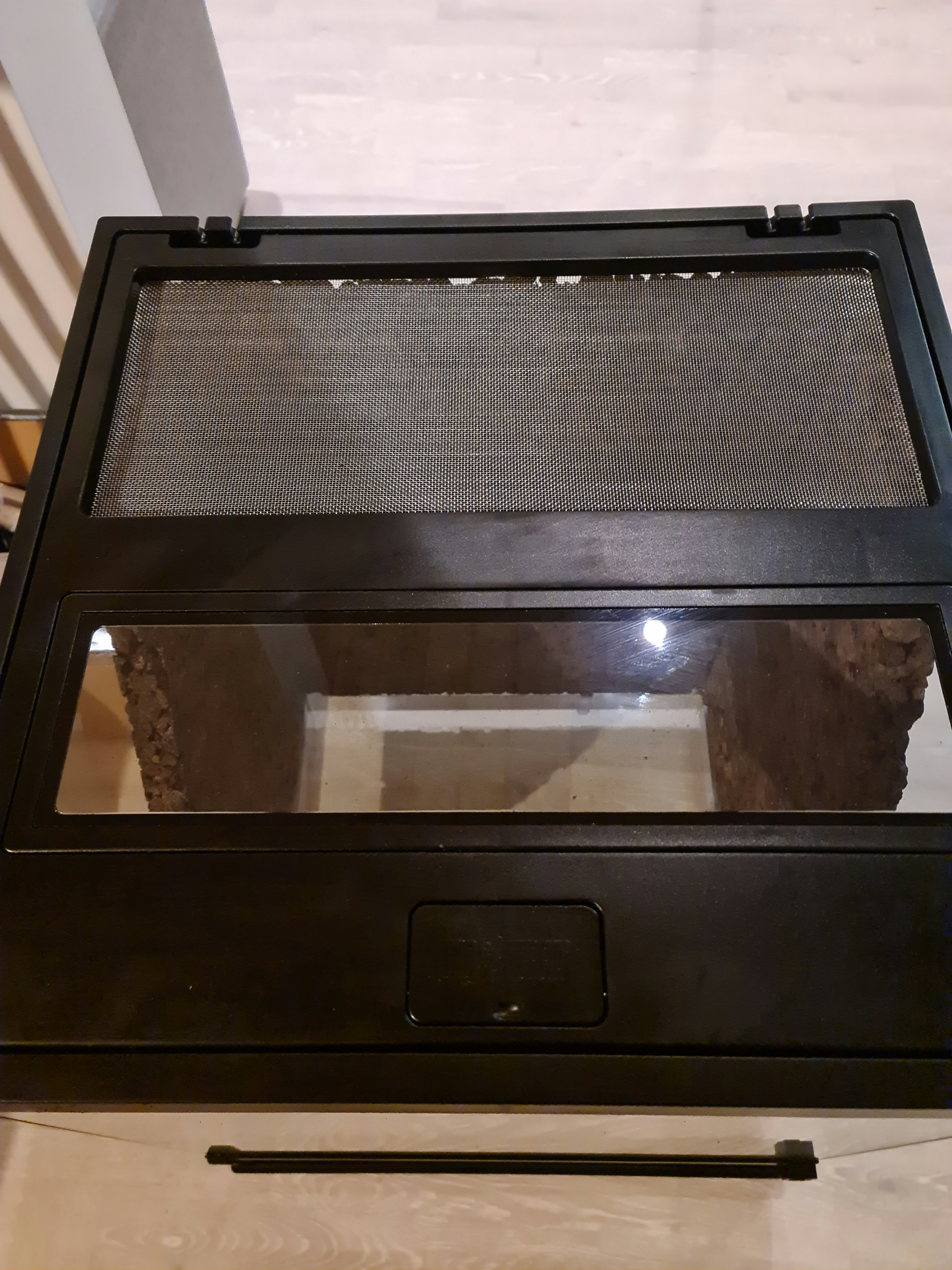 De stora skillnaderna är att det bara är nätvent i halva toppen, resten är plast och glas. Tror inte ventilationen i sig är så mycket flugsäkrare än de andra Exo Terras, möjligen att ventilationen fram är lite tightare, men svårt att avgöra.